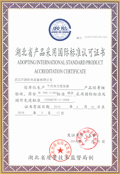 湖北省產(chǎn)品采用國際標(biāo)準(zhǔn)認(rèn)可證書(干變)